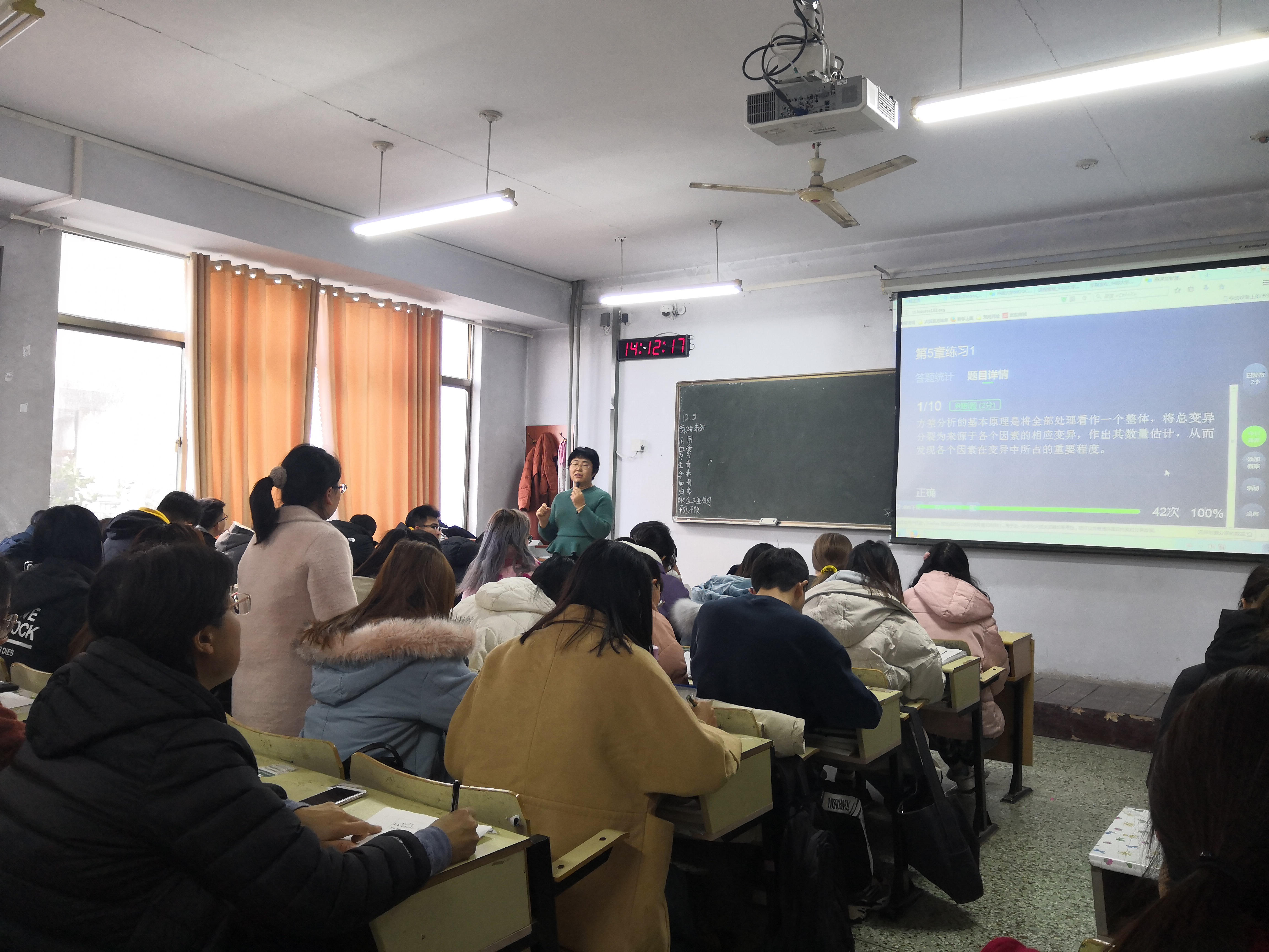 郭新梅通过线上中国大学MOOC平台,检查了同学们线上学习成果,以所学知识点相关练习题为线索,展开进一步学习,她通过对每一道练习题的相关知识点进行小组提问,检验同学们的掌握情况,并对重点、难点进行梳理和强调,在讲解过程中,郭新梅穿插回顾课堂伊始试验设计的方法,从方差分析的原理入手,强化了关键知识点,通过现场线上答题进一步帮助同学们融会贯通。线下课堂上,同学们分小组汇报了方差分析相关知识点,通过整理知识、自我表达,实现了对知识的强化和内化。课后,郭新梅在中国大学MOOC平台上发布了拓展知识和课后作业,通过“线上+线下”混合的方式,促进了教师教学和学生学习的主动性,提高了教学效果。