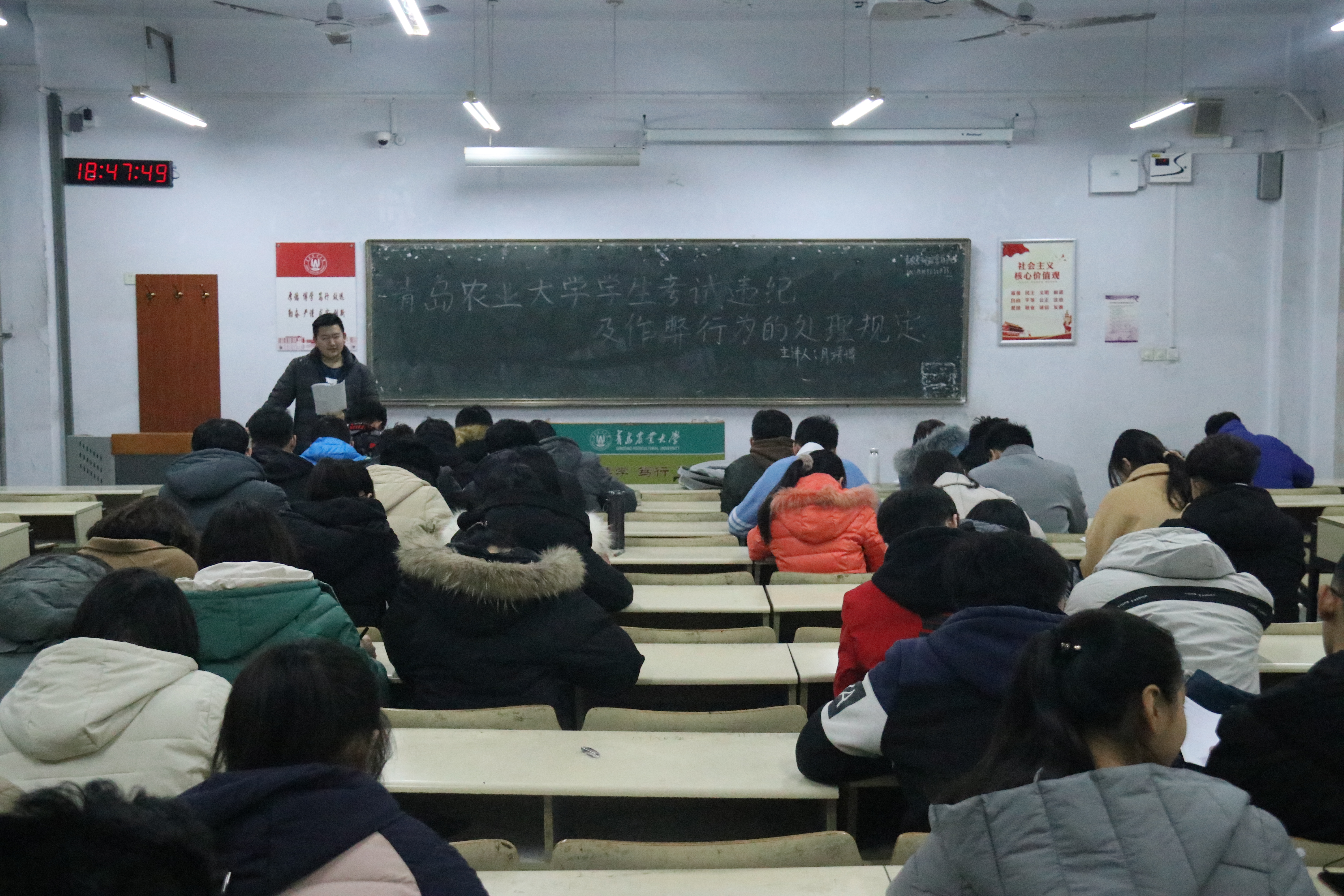 12月22日,皇冠welcome体育登录入口于教学区开展学习《青岛农业大学学生考试违纪及作弊行为的处理规定》主题团课,旨在树立良好的考试风气,保障考试学生的合法权益。2018、2019级全体团员积极参加。