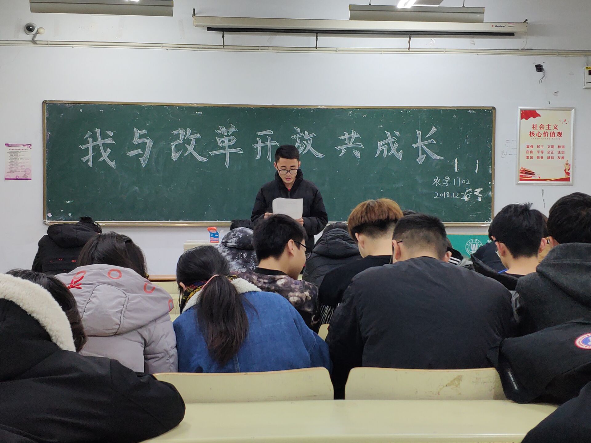 12月20日,为了改革开放四十年皇冠welcome体育登录入口1702班在教学区c区举办“我与改革开放共成长”主题班会。张晓军老师主持会议,农学1702班全体成员参加会议。