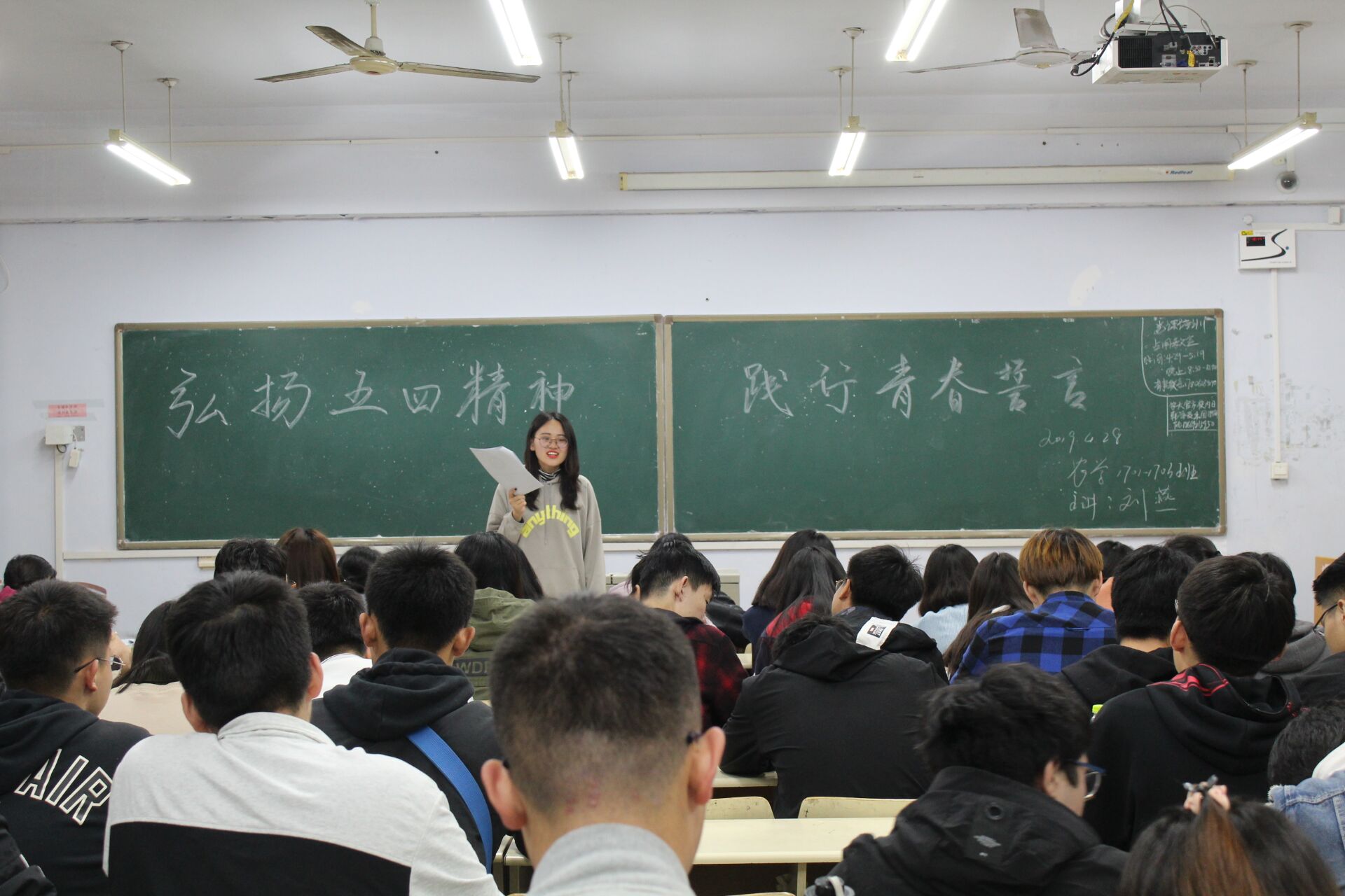 4月28日,皇冠welcome体育登录入口于教学区开展“弘扬五四精神,践行青春誓言”主题团课,旨在让同学们了解五四运动,弘扬五四精神。学院2017、2018级同学积极参加。