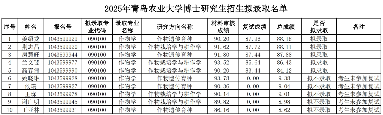 根据《青岛农业大学2025年攻读博士学位研究生招生简章》和《学院2025年博士研究生招生“申请--考核”制实施细则》要求,现将报考我院2025年博士研究生复试成绩及拟录取相关信息予以公示。