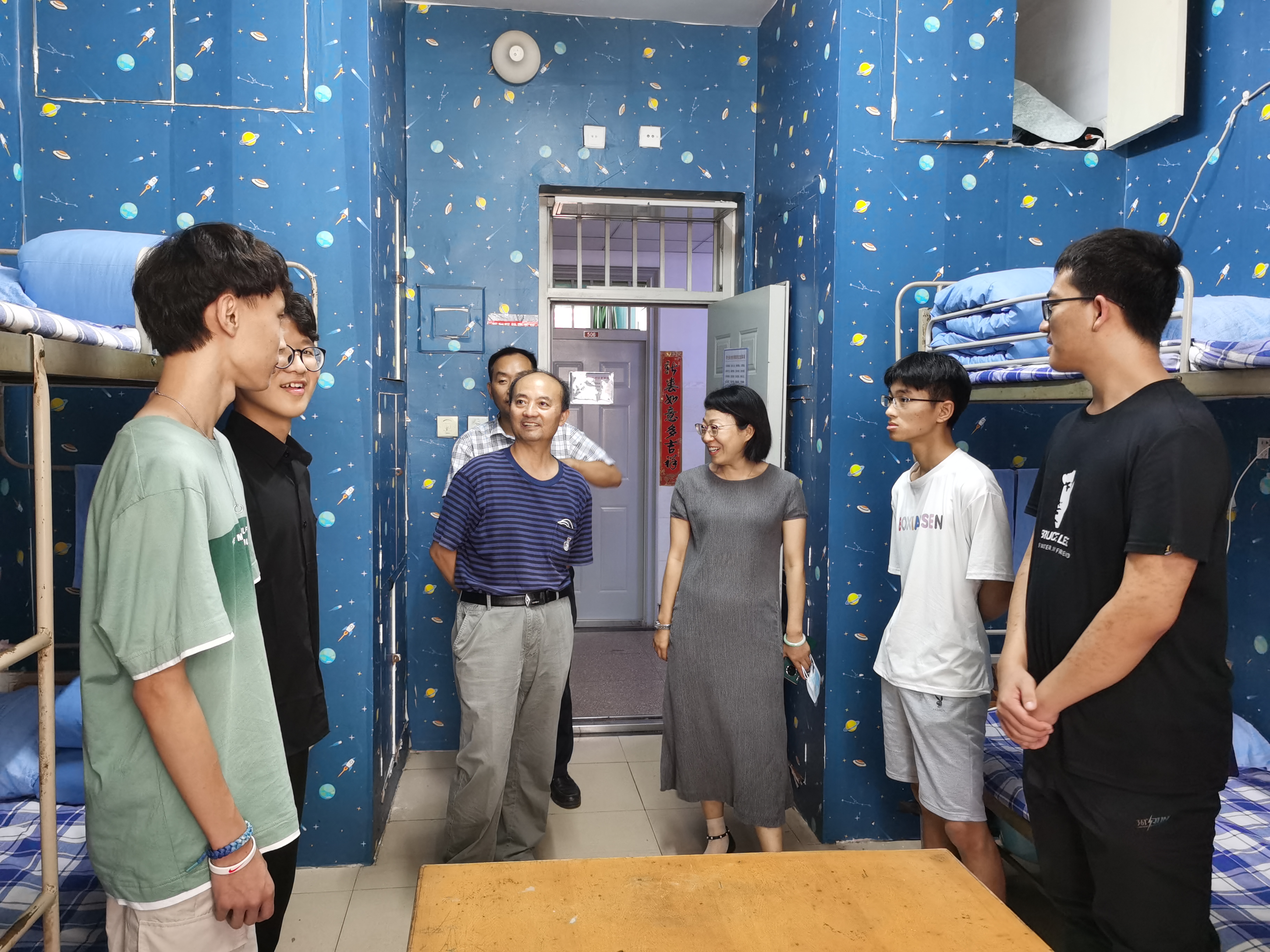 9月13日晚,三天繁忙的迎新工作结束后,学院党总支书记张玉梅、院长刘庆昌、辅导员刘宁以及2020级新生班主任走访了新生宿舍。