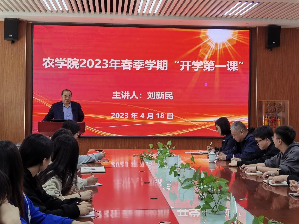 刘新民以2022年党和国家重大发展成就及学校发展为切入点,围绕乡村振兴和农业农村现代化建设,从把牢“有理想”的首要标准、勇承“敢担当”的时代要求、锤炼“能吃苦”的坚毅品格、弘扬“肯奋斗”的光荣传统等四个方面,以生动的语言,详实的事例,为同学们讲授开学第一课,深入阐述了作为公费农科生如何为乡村振兴和农业农村现代化建设贡献青春力量。