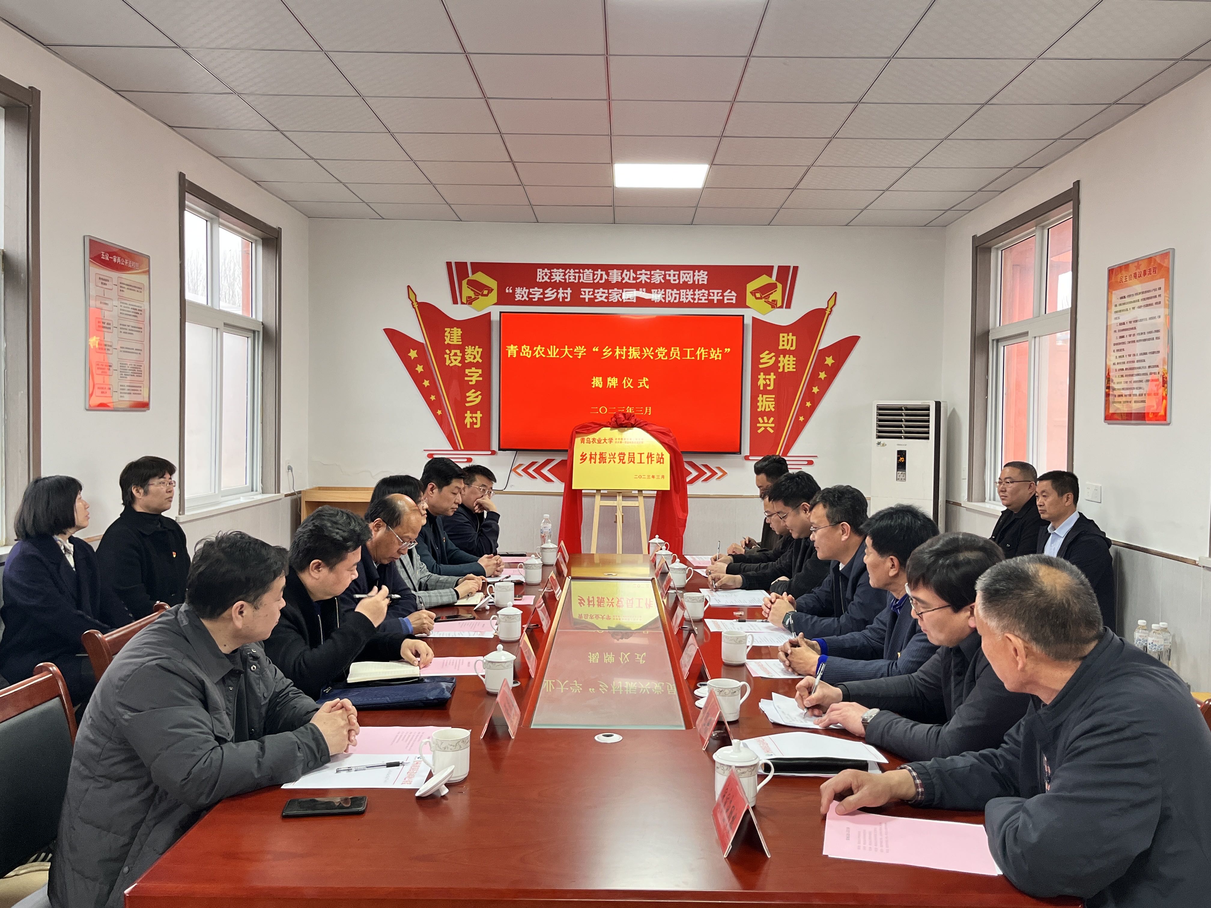 为进一步提升基层党建工作水平,实现校地党建资源共建共享,3月22日,青岛农业大学机关一财务处党支部书记、处长蒋家慧,学院党委书记马伟萍,财务处副处长孙显峰,学院第二(教工)党支部书记张恩盈及部分师生代表一行赴胶莱街道宋家屯参加“乡村振兴党员工作站”揭牌仪式。胶州市省派驻村第一书记和工作队队长张原生、刘文星,胶莱街道党工委书记刘井哲,党工委副书记刘旭东,胶莱乡村振兴工作队队长吴焕明、刘福临等一同参加仪式。仪式由胶莱街道党工委副书记刘旭东主持。